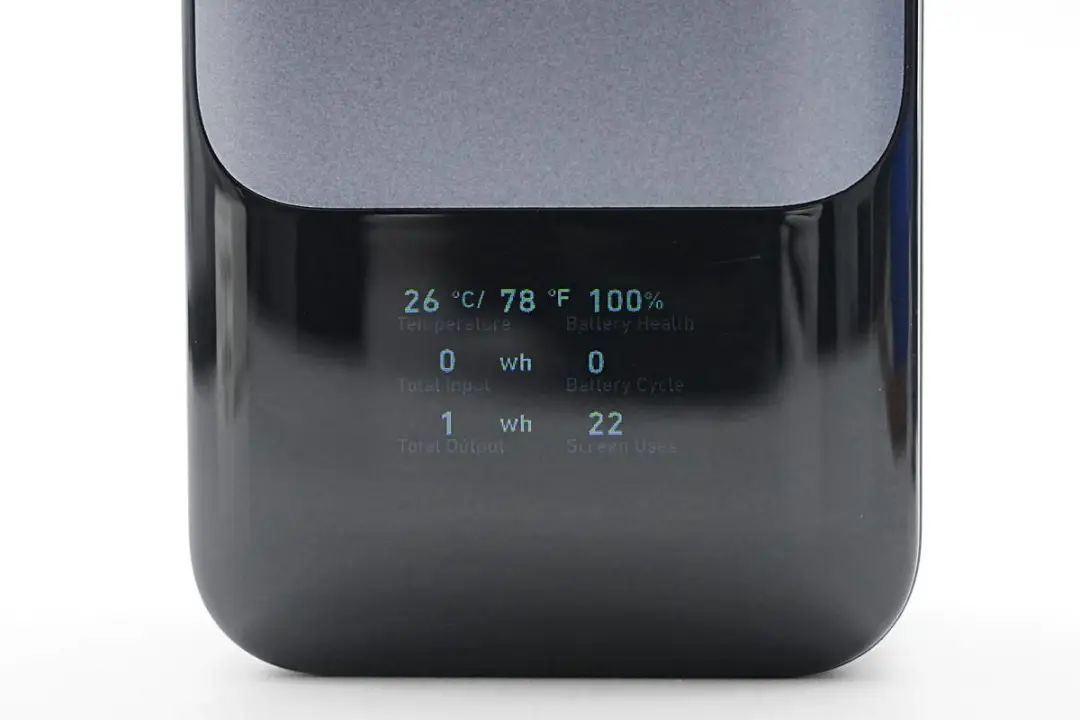 在电量显示界面下,再次单击按键可以显示电池实时温度、电池健康度、输入/输出能量、电池循环周期等丰富内容,方便用户随时查看移动电源使用情况。