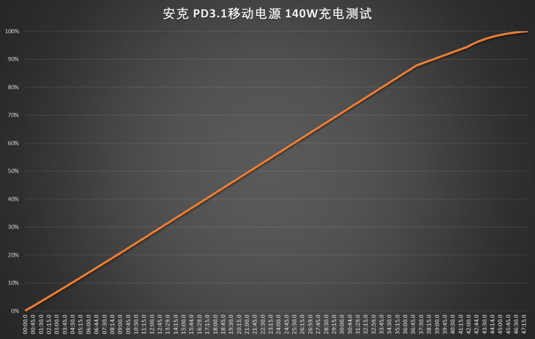 通过上图的充放电曲线可以看到,安克 USB PD 3.1 移动电源 140W 充电全程不到50分钟,接入 140W 负载后放电约33分钟。在如此大的充、放电功率下,移动电源电量曲线变化十分线性、平滑,没有出现跳变、忽快忽慢等情况,电量显示十分精准。