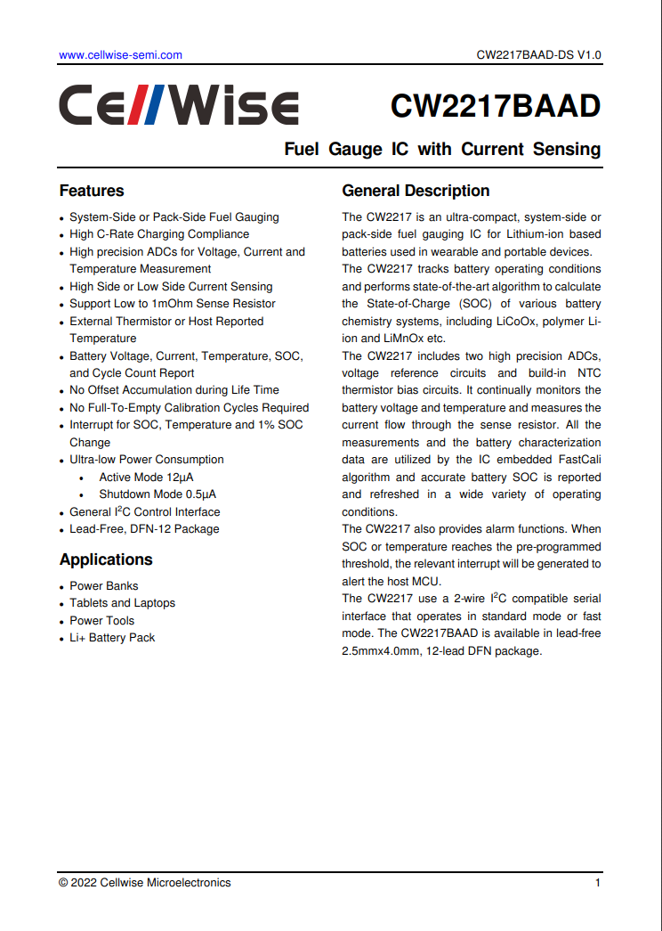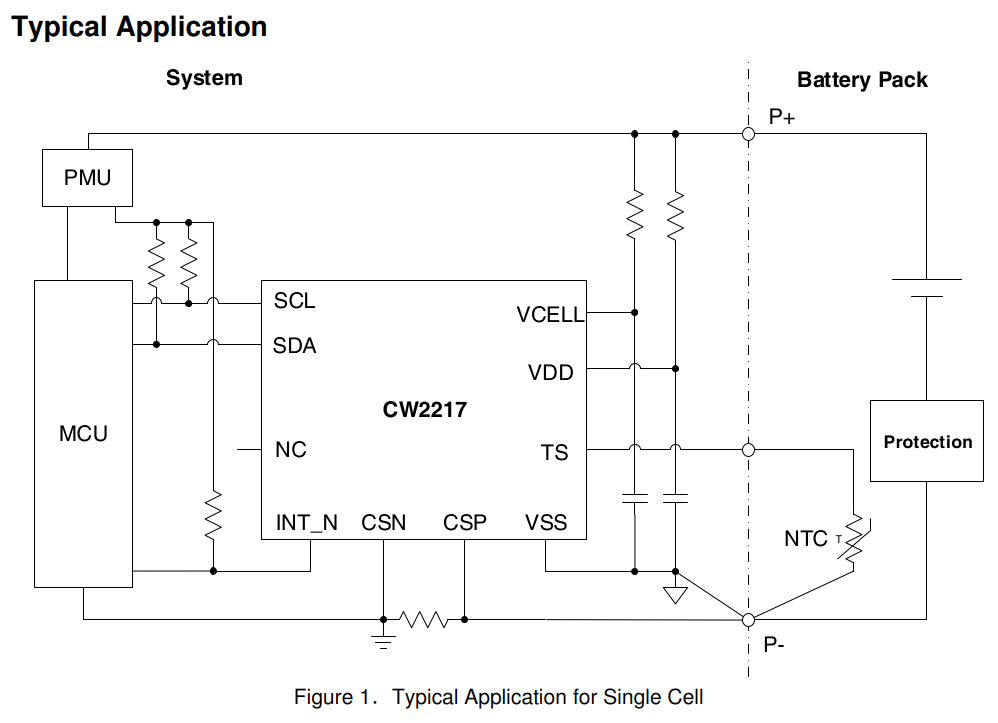 图为赛微CW2217的应用电路图,采用I2C接口与MCU连接,可以上报电压、电流,SOC状态以及电池温度等信息,还支持电池循环次数、寿命等状态显示。CW2217支持单串和多串电池应用,能够满足手机、移动电源、移动储能、电动工具、笔记本电脑等多方面、全方位的锂电池电量计量需求,性能达到国际先进水平。