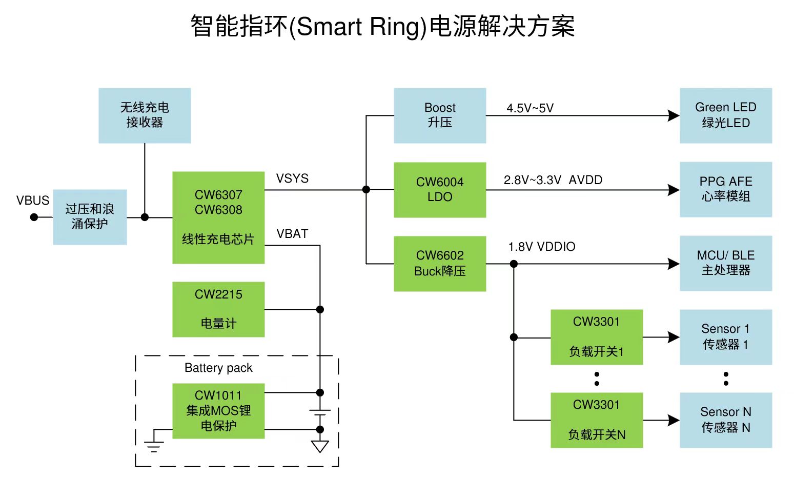 赛微微电智能指环解决方案主打超低功耗、超小尺寸,包含0.5uA超低功耗且带路径管理的线充芯片CW6307/CW6308、300nA Iq的Buck转换器CW6602、300nA Iq的LDO CW6004以及5nA Iq的负载开关CW3301等;同时,该方案还包括微安级工作电流的电量计CW2215和集成MOS的单节锂电保护CW1011。该电源方案可助力实现智能指环的超小空间堆叠和更长时间续航。